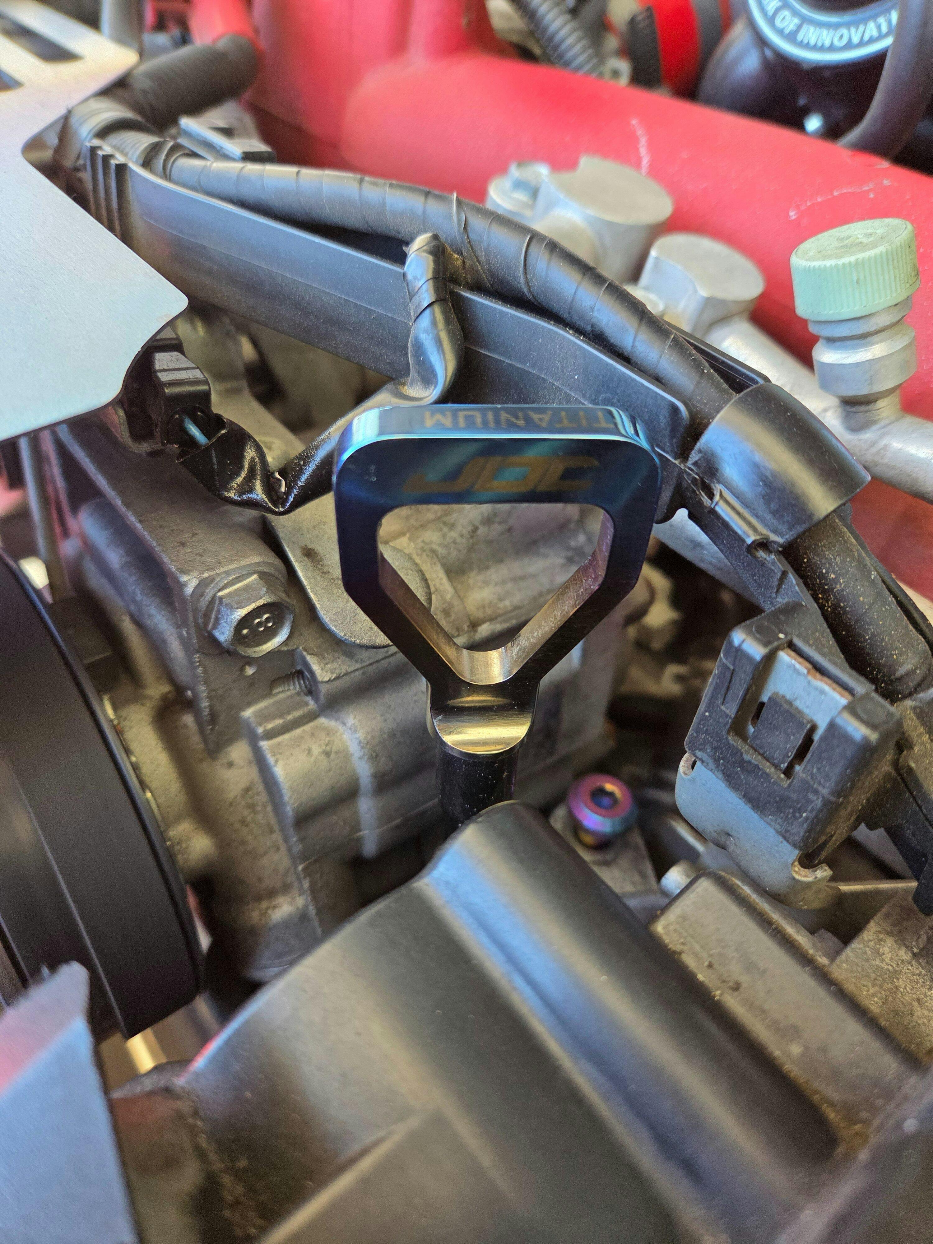The JDC Titanium Dipstick Handle is the perfect addition to your engine bay and installs in minutes! Get rid of your boring plastic handle and replace it with this beautiful solid titanium handle! Each piece is precision CNC machined for a perfect fit every time. Each piece is hand polished before receiving our proprietary cold anodizing treatment for the vibrant colors we're known for!